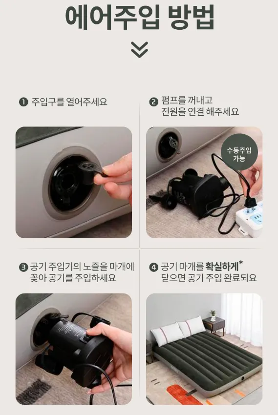펌프 전원을 연결하고 [공기주입용] 의 노즐을 마개에 연결해주세요